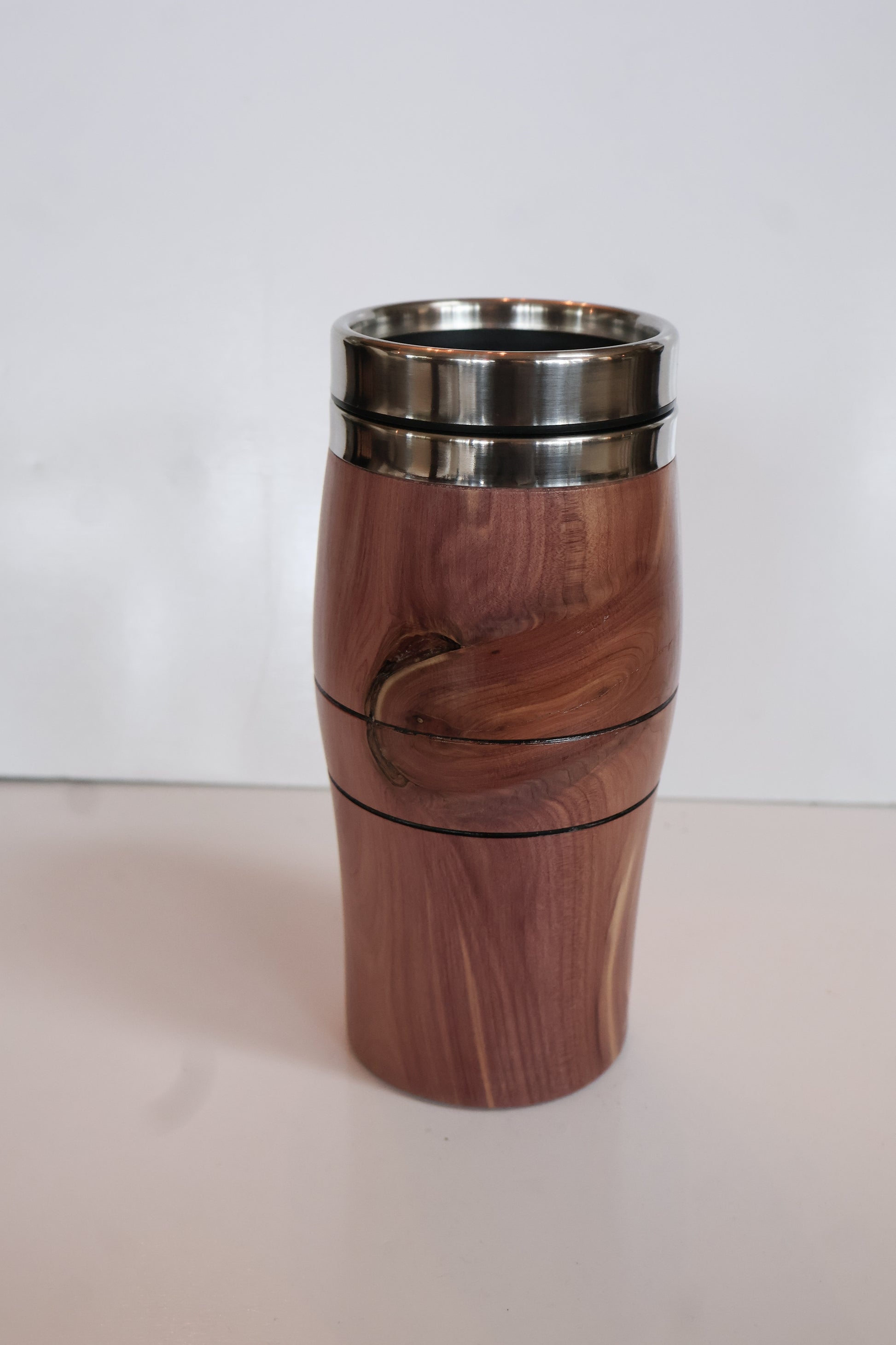 This mug is handcrafted from aromatic cedar and features an hourglass shape with black banding detail. Only one of each mug is available.